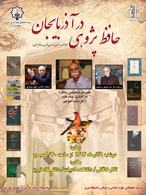 همایش علمی-تخصّصی حافظ پژوهی در آذربایجان از سوی موسسه تحقیقاتی علوم اسلامی و انسانی در روز دوشنبه نهم آذرماه 1394 در تالار خاقانی دانشکده ادبیات دانشگاه تبریز برگزار می شود.