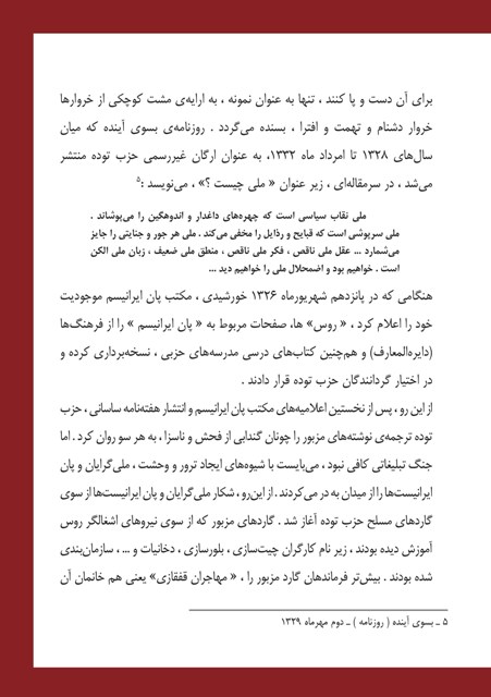 برای درک بهترِ طرز تفکر حزب توده پیرامون مسالهٔ ملی و ملتگرایی و آشنایی بیشتر با منطق « دیالکتیک تاریخی » که بلشویکها میکوشیدند، پایههای علمی برای آن دست و پا کنند، تنها به عنوان نمونه، به ارایهٔ مشت کوچکی از خروارها خروار دشنام و تهمت و افترا، بسنده میگردد. روزنامهٔ بسوی آینده که میان سالهای 1328 تا امرداد ماه 1332، به عنوان ارگان غیررسمی حزب توده منتشر میشد، در سرمقالهای، زیر عنوان « ملی چیست ؟»، مینویسد: